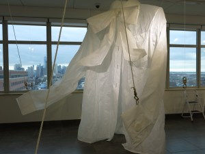 July 2014: Artist in Residence at Women’s Studio Workshop. Working in the C H R C H Project Space, I made two new large pieces, and experimented with rigging to make the garment sculptures move. Artist Tona Wilson (video) and Jonathan Elliott (sound) collaborated with me to create an interactive, site-specific installation piece (‘It’s a Big World in There’) for the former church space. Our project can be seen in these two videos by Stephen Blauweiss. Thanks WSW and CHRCH!!!!