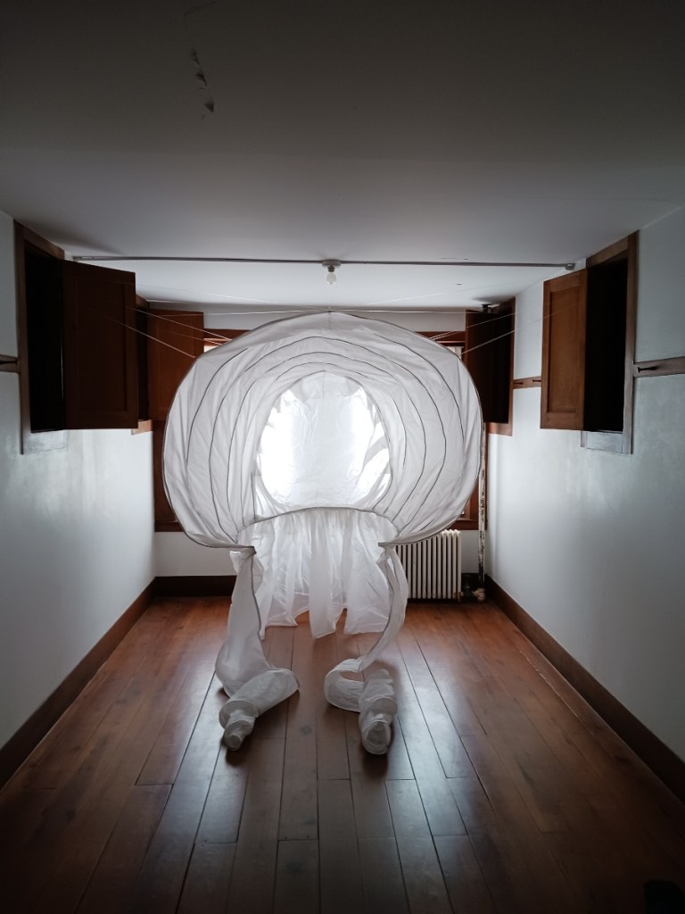 September 12-13, 2014: Micro-Festival of Unfinished Puppetry. Installation presentation of interactive portions from ‘It’s a Big World In There’. The audience became the puppeteers by pulling ropes to make three giant garments move through video images created by Tona Wilson. The clothes whipped like sails, in time to a soundtrack by Jonathan Elliott. We got great feedback and had a blast in Trois-Rivieres, Quebec!