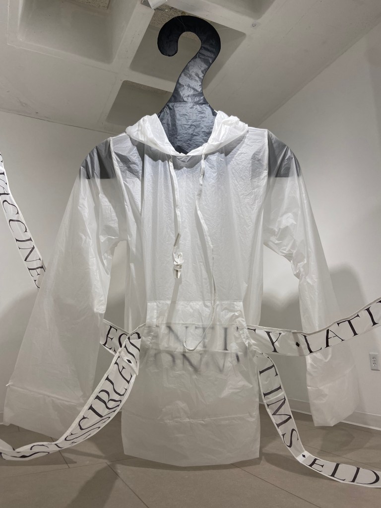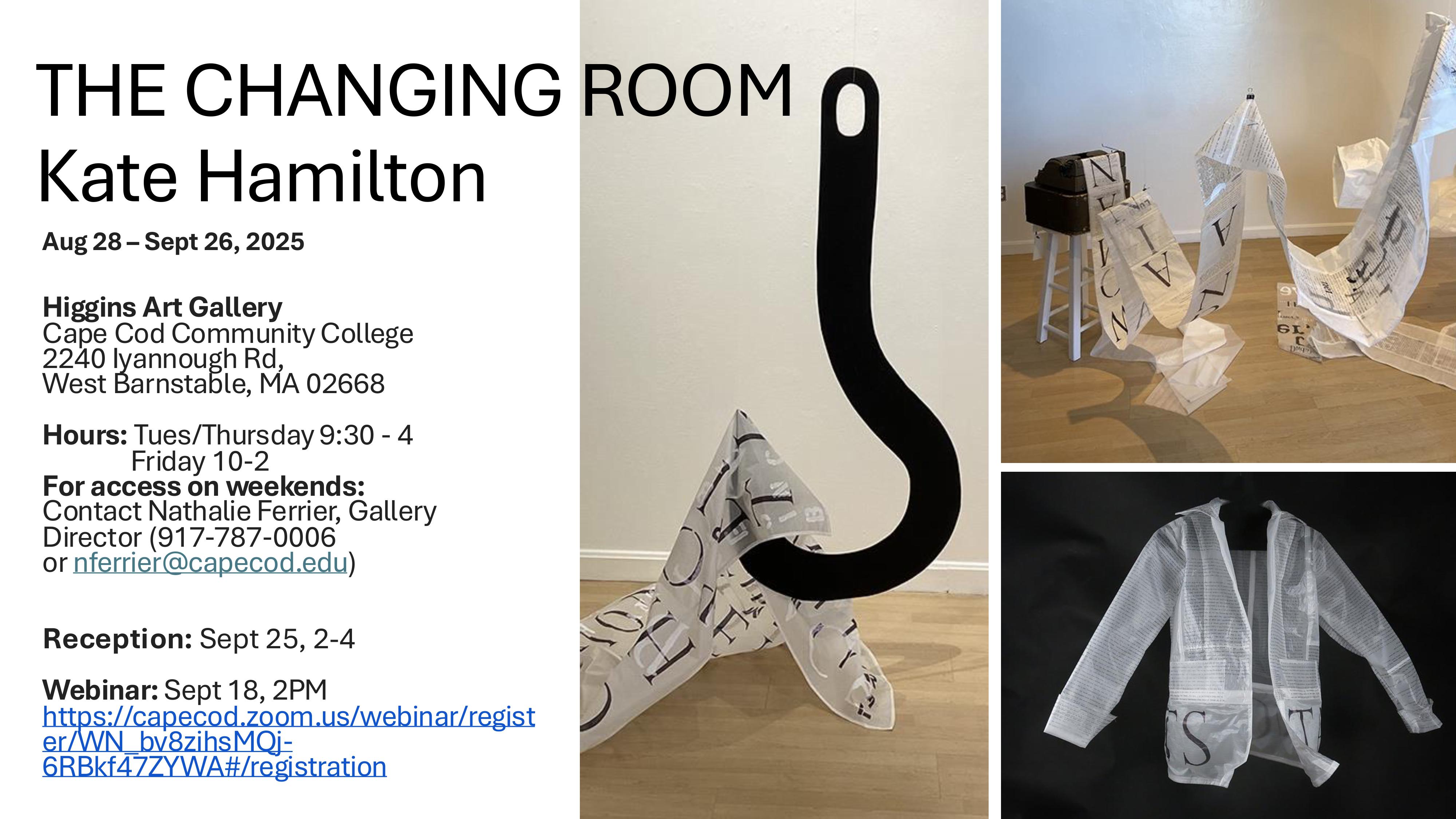 Thank you to Suzy Jeffers whose expertise and energy made it possible to install this show. To Jim Fawcett for his marvelously clever giant snap rivet connectors for one of the large sculptures. And to Michael Asbill and his 20th Century Art History class, who turned off the lights at the opening, wheeled out overhead projectors and projected their own interpretive texts and images onto the garment sculptures! The class: Keysla Class Colon, Jennifer Hoffman, Tiffany Incorvaia, Deirdre Kenney, Sam Lieghing, Taylor Liberati, Chris Pratten, Cheyenne Rossler, Terriann Smith, Rachel Steyer, Victoria VanEtten and Elena Yess. Thanks also to Tona Wilson for her projector guidance and know-how and to Jessica Poser for loaning several great projectors.
