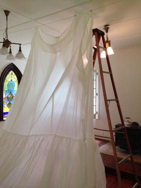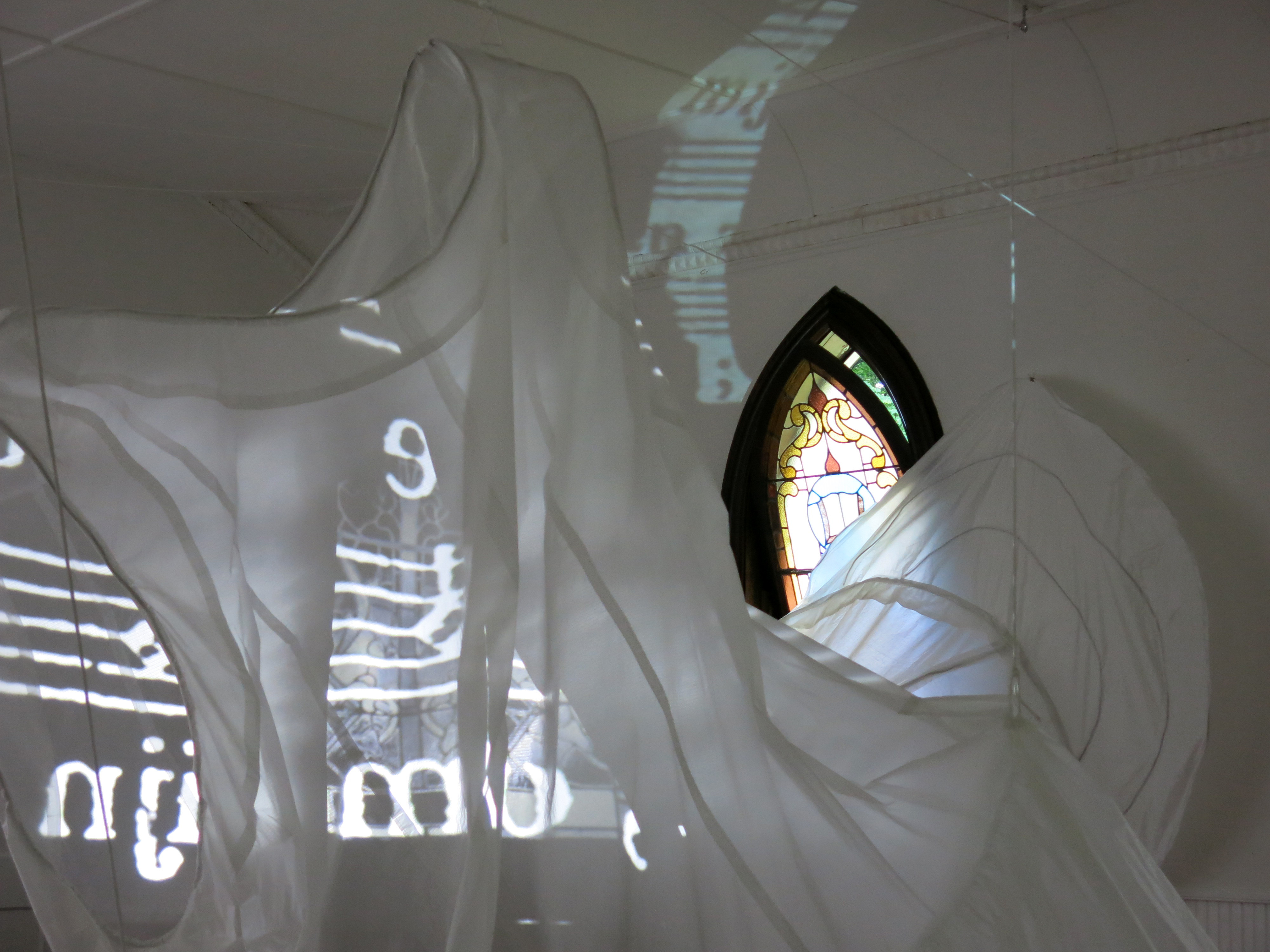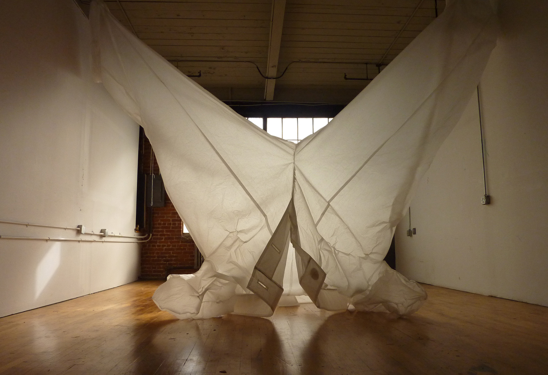 July 2014: Artist in Residence at Women’s Studio Workshop. Working in the C H R C H Project Space, I made two new large pieces, and experimented with rigging to make the garment sculptures move. Artist Tona Wilson (video) and Jonathan Elliott (sound) collaborated with me to create an interactive, site-specific installation piece (‘It’s a Big World in There’) for the former church space. Our project can be seen in these two videos by Stephen Blauweiss. Thanks WSW and CHRCH!!!!