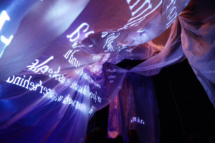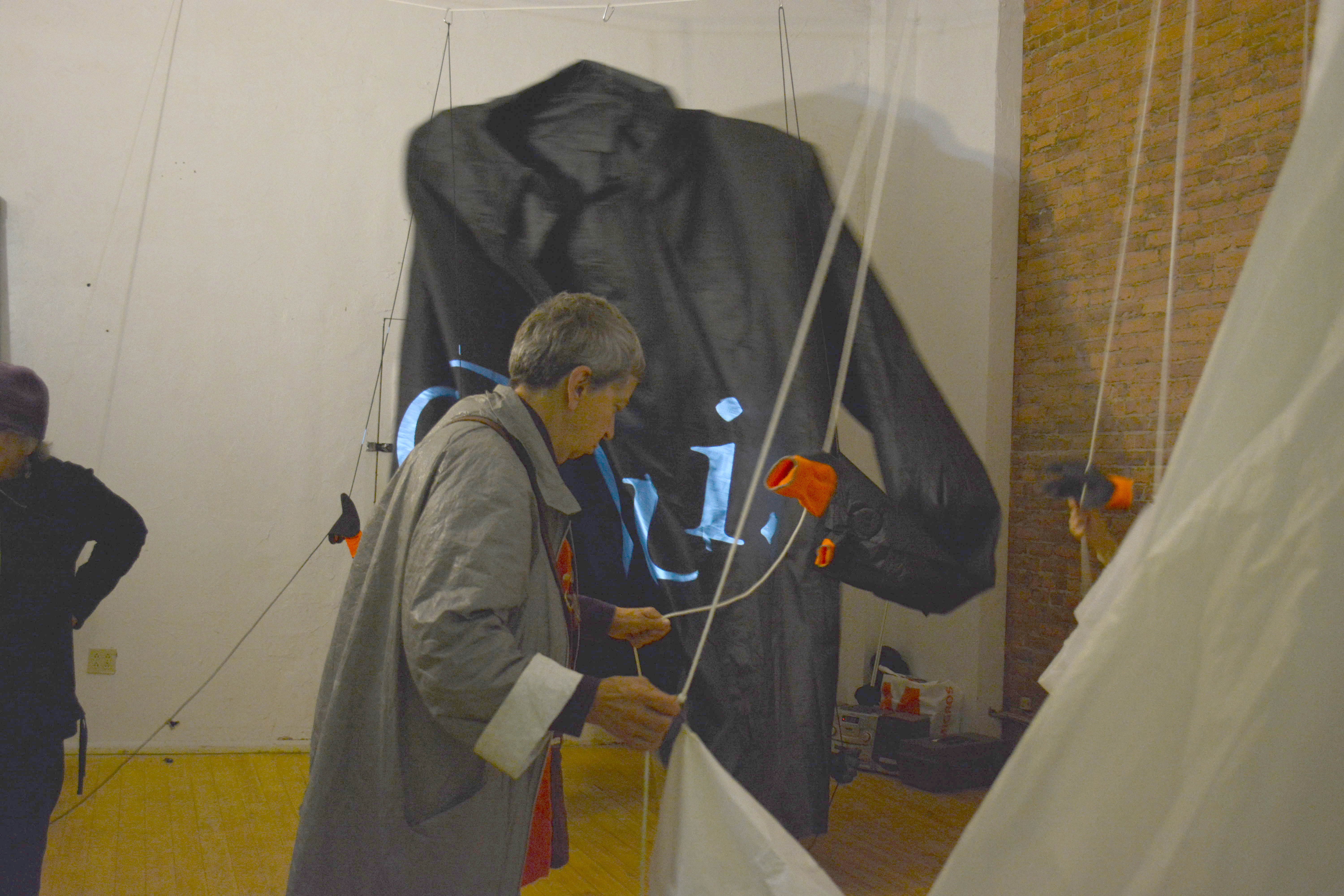 We had a great time. Our four hours of ‘show time’ stretched to eight, because people kept coming! Ropes were pulled, and the two giant shirts moved and responded to each other, while Tona Wilson’s wonderful quirky videos flashed info onto the moving shirts and the people moving them. We had visitors of all ages, and were blown away by two dancers who improvised an impromptu Butoh-style dance with the black shirt!