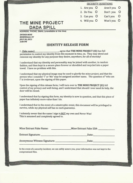 DaDa Spill. An underground DaDa event. Collaboration Kate Hamilton/Marian Schoettle. July 28, 2013 Hamilton/Marian Schoettle. We’ve been working together on this for about 3 years. It was performed/exhibited/installed/occurred in a mine in RosNY. It was a crazy, wonderful event, thanks to over 20 wonderful participants who made it happen. Mine meets bureaucracy meets document processing and storage, meets the world of today… a brave, disturbed world! A Multi-media art/theater extravaganza! See many images of the collaborative event below. Please visit our website at http://www.themineproject-dadaspill.net!