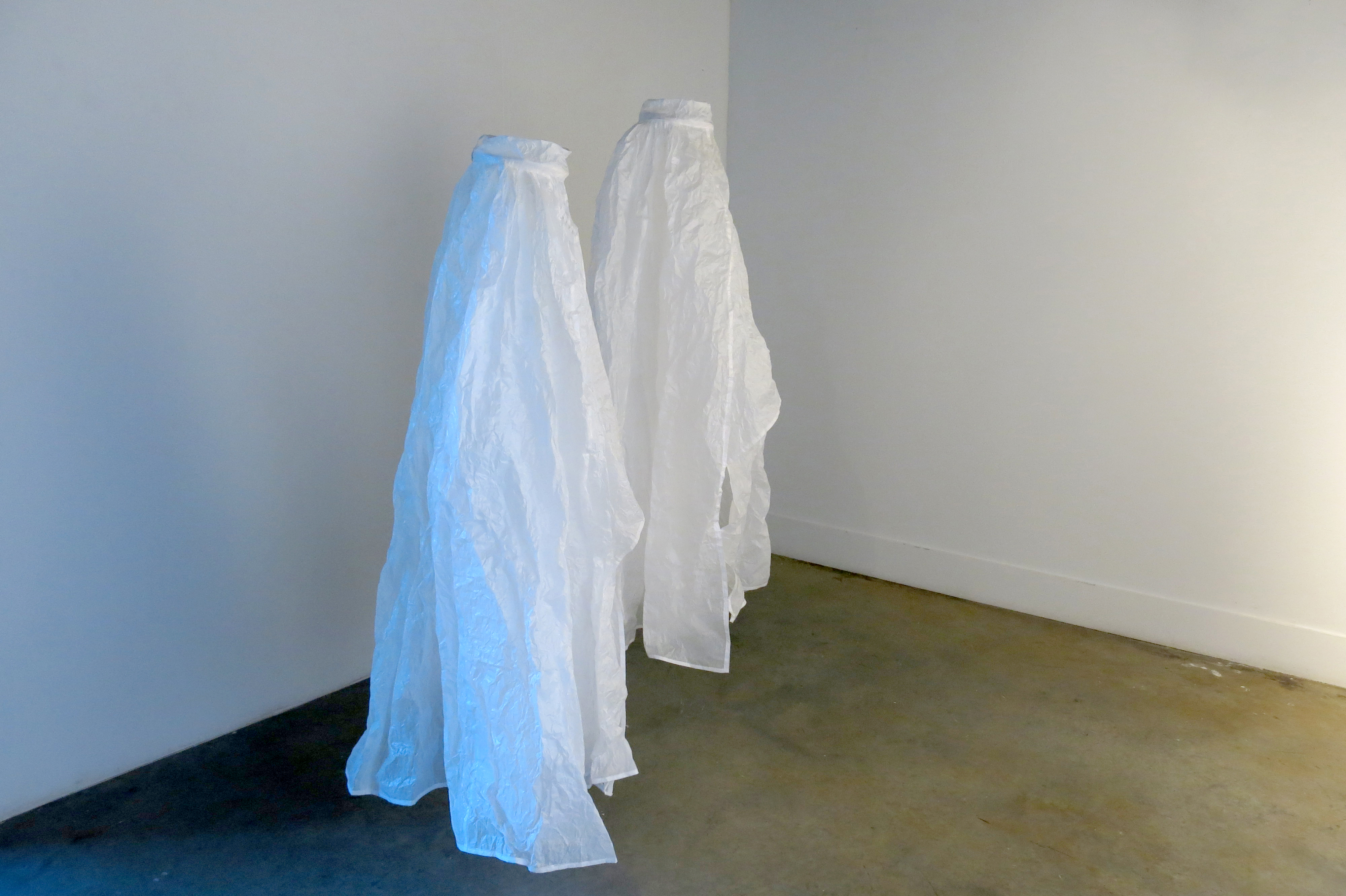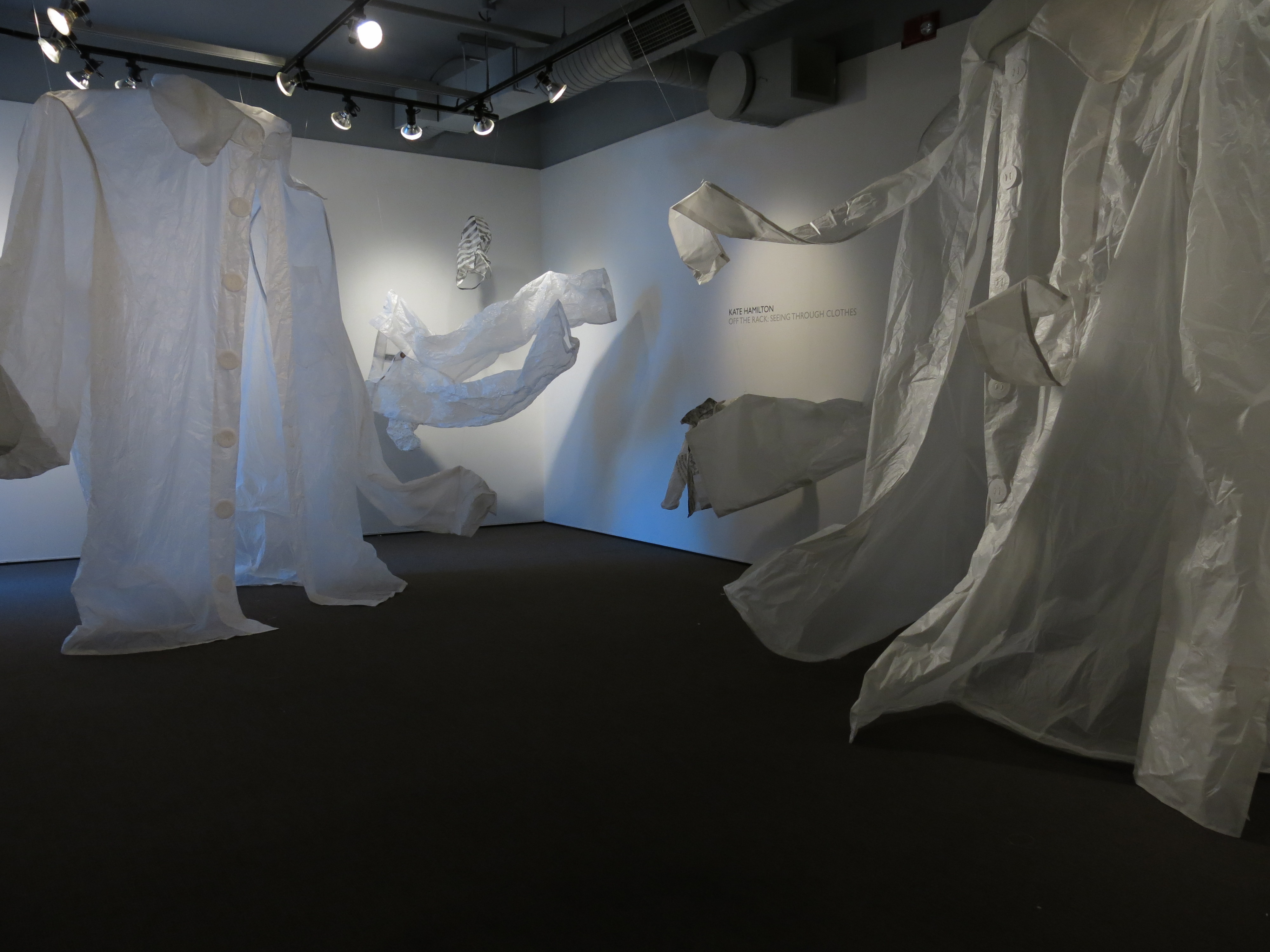 Thank you to Suzy Jeffers whose expertise and energy made it possible to install this show. To Jim Fawcett for his marvelously clever giant snap rivet connectors for one of the large sculptures. And to Michael Asbill and his 20th Century Art History class, who turned off the lights at the opening, wheeled out overhead projectors and projected their own interpretive texts and images onto the garment sculptures! The class: Keysla Class Colon, Jennifer Hoffman, Tiffany Incorvaia, Deirdre Kenney, Sam Lieghing, Taylor Liberati, Chris Pratten, Cheyenne Rossler, Terriann Smith, Rachel Steyer, Victoria VanEtten and Elena Yess. Thanks also to Tona Wilson for her projector guidance and know-how and to Jessica Poser for loaning several great projectors.