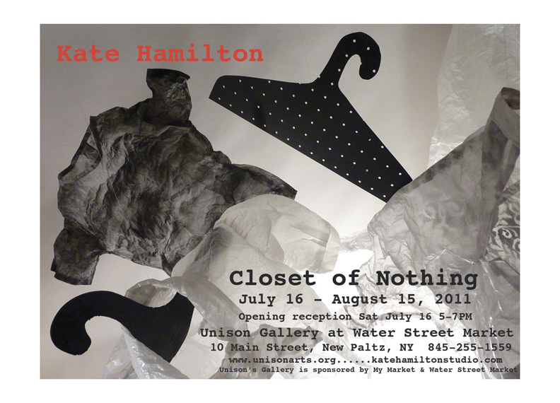 Since July 16, Unison’s Water Street Market Gallery has been filled with clothes, but you may have trouble seeing them: the overalls, tee-shirts, slips, dresses, men’s formal shirt and cummerbund and hats are sewn out of waxed paper (actually an archival glassine paper – a step up from the stuff that you buy at the supermarket). When the room is full of light, one is more apt to see the details of their construction: seams, crinkles, pockets, zippers, hooks, snaps, buttons and buttonholes. “They’re like 3-D X-rays. You can see through them, and they kind of glow,” noted their creator, Kate Hamilton.