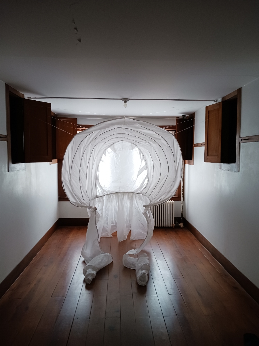 Viewer: I invite you to use the typewriter to express your thoughts onto the never-finished pussy-bow blouse, to slowly pull ropes to transform the fish skeleton into a boat. Let your breath and body movements reveal the aquatic nature of bobbing bonnets. And find your own way to understand the changing room’s story.